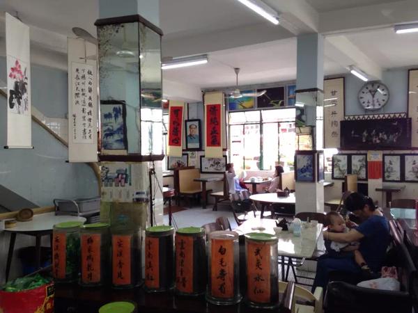 这家茶楼现在依然保留着多年以前的装潢,架子上摆着有年代感的古玩,字画贴满了每一面墙头,头顶的老式风扇把晨曦挥斩成斑斓的光影。